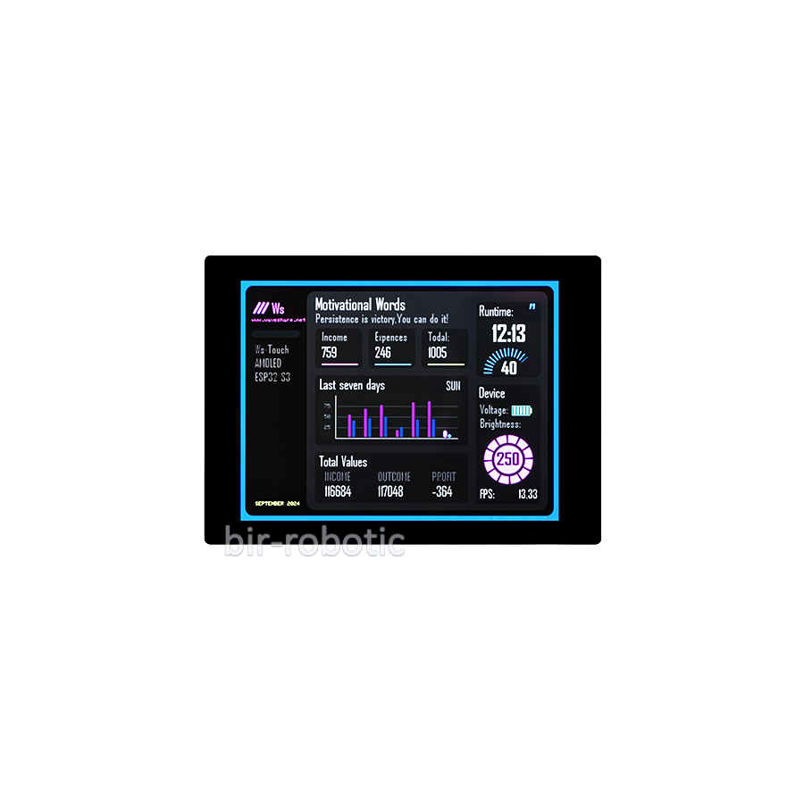 برد توسعه ESP32-S3 با نمایشگر 2.41 اینچ AMOLED لمسی مدل B، یک پلتفرم قدرتمند و چندمنظوره بر پایه تراشه ESP32‑S3R8 است که با پشتیبانی از شبکه‌های Wi‑Fi 2.4GHz و Bluetooth 5 LE، امکان توسعه انواع دستگاه‌های هوشمند با رابط گرافیکی مدرن را فراهم می‌سازد. این برد با داشتن نمایشگر لمسی AMOLED 2.41 اینچ با رزولوشن 600×450 پیکسل، رنگ 16.7 میلیون، و درایور RM690B0 به همراه کنترلر لمسی FT6336، قادر است محیط‌های گرافیکی روان و زیبا را اجرا نماید. همچنین با تراشه حرکتی QMI8658 (IMU شش‌محوره)، تراشه RTC PCF85063 و اسلات کارت حافظه TF، مجموعه‌ای کامل برای توسعه رابط‌های کاربر هوشمند (HMI)، سنجش حرکت، و کاربردهای IoT فراهم می‌آورد.