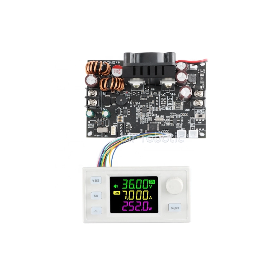 ماژول کاهنده افزاینده دیجیتال 250 وات XY3607F، یک مبدل DC-DC پیشرفته و پرقدرت است که برای کاربردهای صنعتی، آزمایشگاهی و پروژههای حرفهای الکترونیک طراحی شده است. این ماژول با توان خروجی اسمی تا 250 وات، قابلیت افزایش (Boost) و کاهش (Buck) ولتاژ را بهصورت هوشمند و پیوسته فراهم میکند و امکان تثبیت دقیق ولتاژ و جریان خروجی را در بازه وسیعی از شرایط بار ارائه میدهد. طراحی مبتنی بر قطعات قدرت باکیفیت، سلفهای جریان بالا و ترانزیستورهای توان، بازده بالا و پایداری الکتریکی مطلوب را تضمین میکند. نمایشگر دیجیتال رنگی تعبیهشده بر روی پنل، مقادیر ولتاژ، جریان، توان و وضعیت کاری ماژول را بهصورت لحظهای نمایش میدهد و کاربر را قادر میسازد پارامترها را با دقت بالا پایش و تنظیم کند.